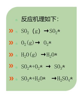 含有二氧化硫的烟气,经过预处理以后,通过主管道进入装有超级活性炭的脱硫塔,烟气中的二氧化硫被吸附在活性炭的表面,与烟气中的氧在催化剂的作用下产生化学反应,生成三氧化硫,慢慢的达到一定饱和浓度后,再与进入脱硫塔的水产生化学反应,生成稀硫酸,通过管道回收再利用。